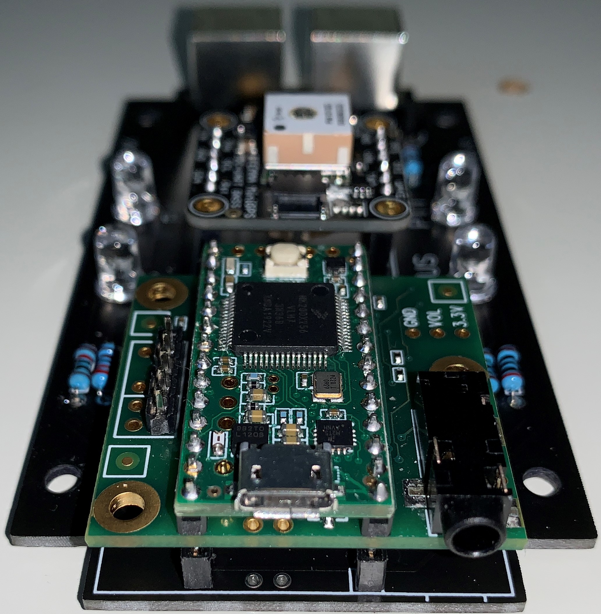The interface connects to a computer with the Teensy’s micro-USB connector. To the computer it presents as a USB sound card and two serial ports. The first serial port is connected to the radio and can be used for CAT control or programming the radio. The blue and green “TX” and “RX” LEDs light up whenever a byte is sent or received. This serial port can also be used for PTT via one of its control lines (RTS or DTR.) The second serial port is connected to the GPS. It can be used to receive NMEA sentences for something like APRS.